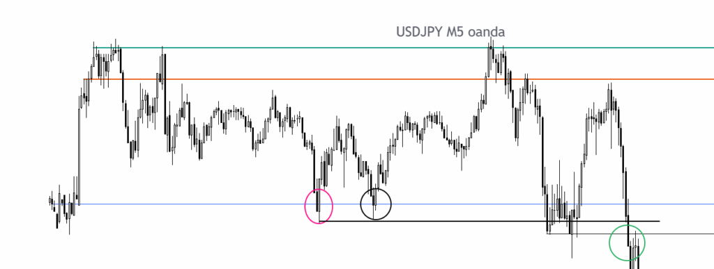5分足でスキャルピングラインが1本引かれると、ほぼ必ずもう1本が形成されます。今回は高値側のスキャルピングライン(緑の太線)に対して、安値方向にもう1本(ピンク丸付近)が作られました。