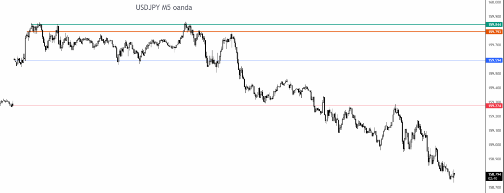| 緑(太線) | 159.844 | 5分足スキャルピングライン(高値側)。窓開けボックスの上限付近 |
